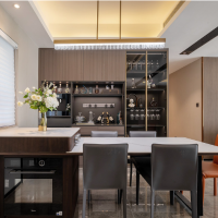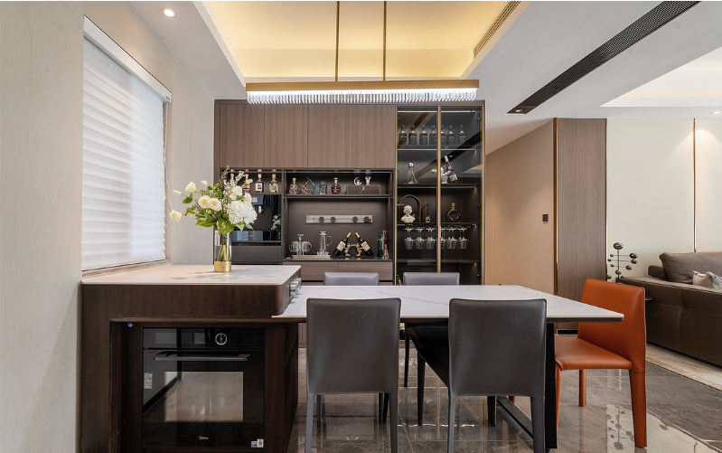 本案整体采用意式轻奢风格,注重空间的简洁与舒适感。功能分区清晰合理,客厅开阔明亮,便于家人日常互动交流。设计尤为侧重实用收纳,全屋多处定制柜体满足储物需求,各卧室均配备大衣柜与置物台,餐厅则增设了展示酒柜,兼顾屋主的收藏与品味爱好。阳台被巧妙打造成休闲花园,为家居环境增添自然意趣,共同营造出一个温馨而贴合生活的理想居所。
